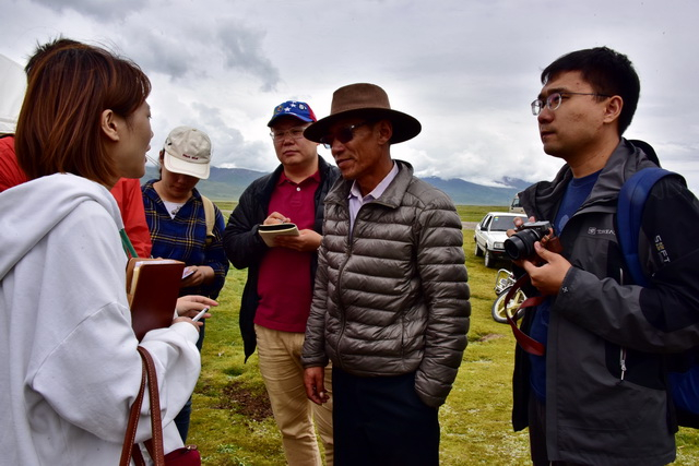 青海省祁连县野牛沟乡大浪生态畜牧业专业合作社董事长玛久在向记者介绍草原保护情况。摄影/章轲