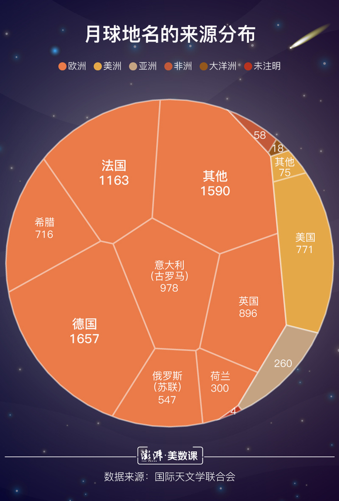 虽然有权给月球起名字的IAU是国际组织,但很大程度上,这背后还是由各个国家探测月球的实力所决定的。在9000多个月球地理实体命名中,分属各国的名称数量相差很大。其中,欧洲国家占了绝大部分,美洲次之,而亚非国家仅占了其中的极少数。