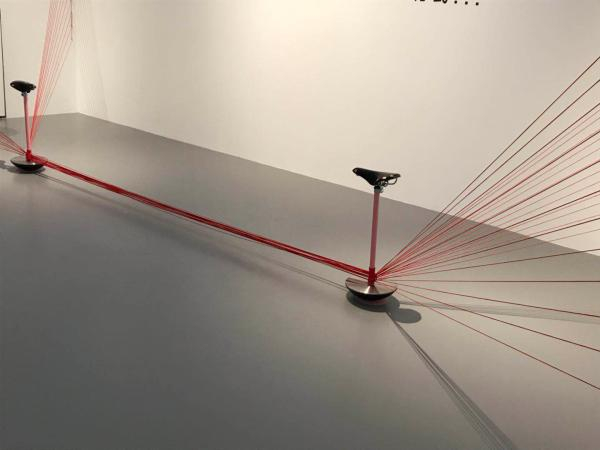 记者看到,展厅内摆放着不少的设计款家具,尤以沙发为主,也有以互动为主的设计,强调人与人的联系。游戏衣架《Pick-up sticks》可在空间中任意开合、移动、设计师借此探讨着空间陈列的独立性和自由性;设计作品《你和我》则是由两个不倒翁形式的自行车座椅和相连的红线组成,意在探索人和人之间的关联。