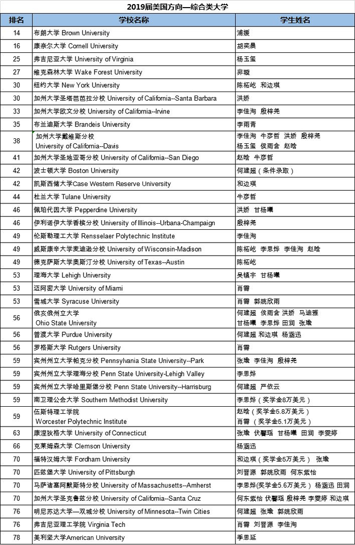 2019届的毕业生里中考分数568的杨玉玺同学是西南地区唯一录取到弗吉尼亚大学(美国排名25)的学生;565分的非璇同学是西南地区唯一录取到维克森林大学(美国排名27)的学生;567分的赵晗同学顺利斩获加州大学圣地亚哥分校(美国排名41)录取;564分的周安安获得了老牌理工文理学院联合学院(美国排名39)的录取及10万美元的奖学金;555分的陈柘屹同学被纽约大学(美国排名30)录取……当年,云师大附中的录取线是568分。