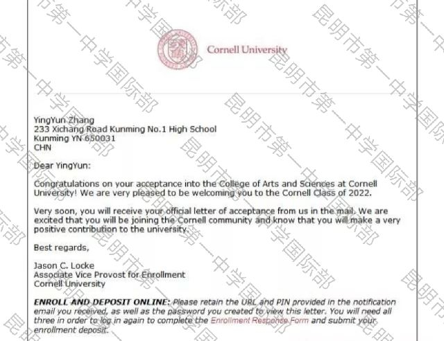 中考分数825(满分880分)的张潆允同学是2018年西南地区唯一被常青藤康奈尔大学(美国排名16)录取的学生;她当年的中考成绩距离云南师大附中的分数线差了整整四分。
