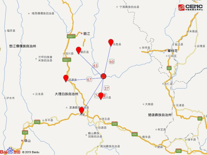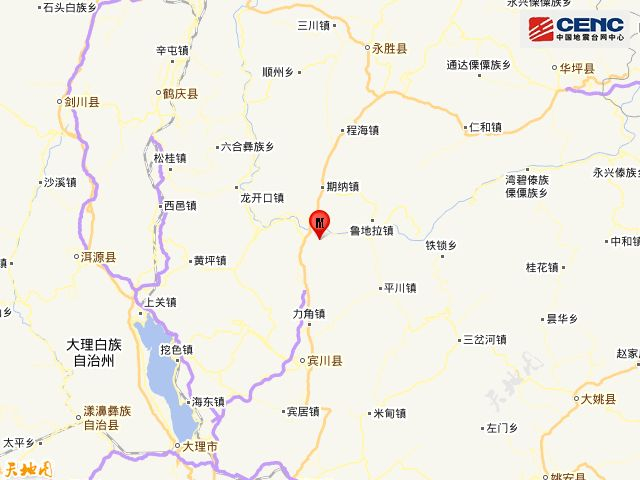 周边县城:震中距宾川县37公里、距永胜县60公里、距鹤庆县63公里、距洱源县67公里、距大理市74公里,距大理白族自治州71公里,距昆明市244公里。