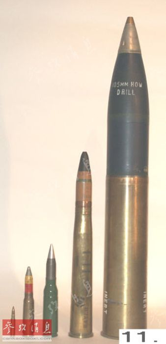 图为AC-130使用的几种主要弹药对比图,最右侧的为105毫米榴弹炮弹,向左排列依次为40毫米机关炮弹、25毫米转管炮弹,20毫米火神炮弹和7.62毫米速射机枪子弹。