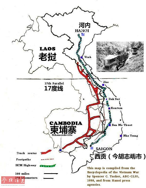 图为美军炮艇机的重点打击目标-(干线+支线)总长约2万千米的“胡志明小道”(又称“中央走廊”),这是一条贯通越南南北的秘密补给运输线,当时位于越南北部的越共主要通过该线,源源不断地向南部输送兵员、军火及物资,对抗美军,小图为在胡志明小道上行驶的越共卡车运输队。