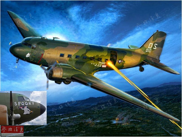 介绍AC-130前,先来了解下“空中炮艇机”的历史。这一独特机种起源于越战,当时美军需要对抗数量众多而零散的越共游击队、村庄和车队,对付这些“软目标”的最佳手段是各种口径的火炮,为此美军需要一种火力强大且留空时间长的攻击机。实际早在越战前的1961年,一名名叫麦克唐纳的中校就提出了在运输机上加装武器改为攻击机的设想,1965年,基于C-47运输机改进的AC-47“幽灵”(又称 魔龙)很快投入实战。图为艺术家笔下的AC-47炮艇机。