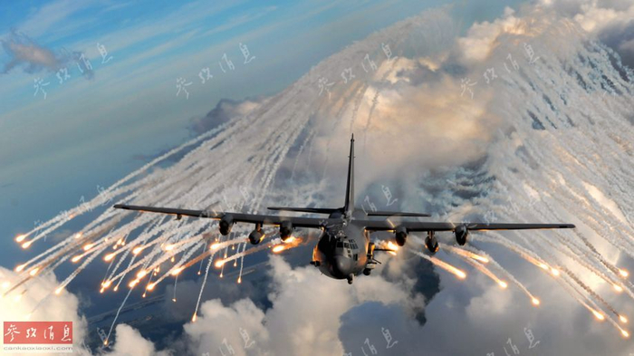 1990年海湾战争爆发后,AC-130也作为主力机型参战。1991年1月31日凌晨,一架AC-130H在执行作战任务时,被一名伊拉克士兵发射的“箭2”单兵防空导弹击落,暴露出炮艇机在面对拥有较强防空火力的敌军时,仍存在生存力较差的弱点。图为AC-130U在演练中释放红外干扰热焰弹,尽管搭载了相当数量的热焰弹,该机在面对防空导弹时仍力不从心。