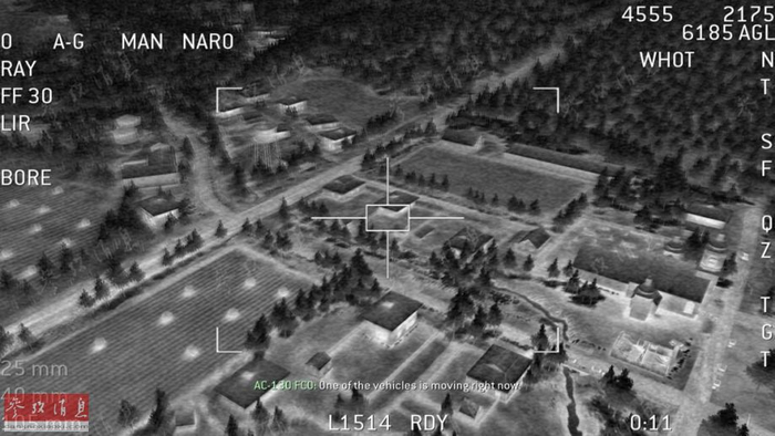 与电影不同,AC-130可谓是游戏中的“明星”,相信许多人首次了解这种“大杀器”,都是通过2007年的《使命召唤:现代战争》。游戏中首次忠实还原了AC-130的传感器操作员界面的各种细节,使人有种身临其境的感觉。