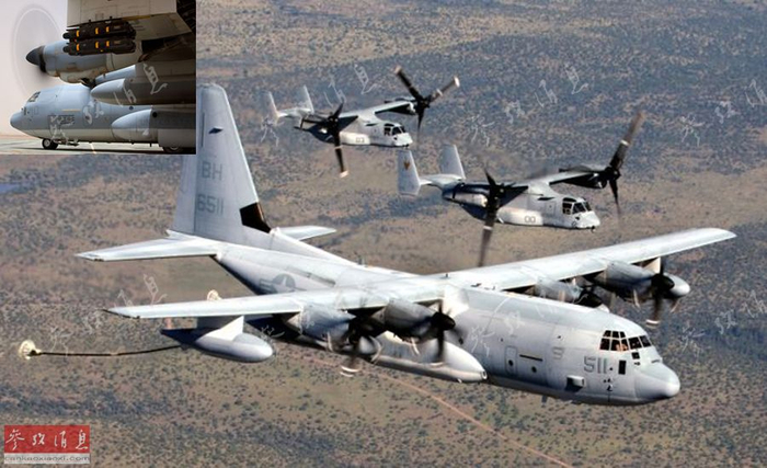 受空军将MC-130改装为炮艇机的启发,美海军陆战队也于2009年8月启动了“收割鹰”计划,将一部分现役的KC-130J加油机改装为模块化多用途炮艇机,小图为挂载地狱火导弹起飞的KC-130J“收割鹰”。