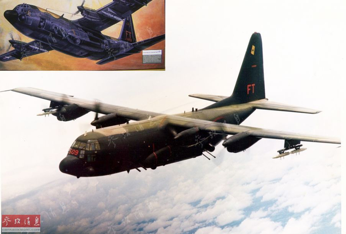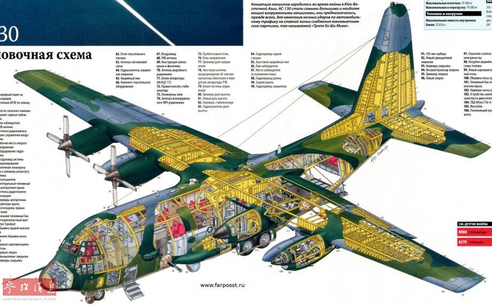 随着时代变迁,AC-130系列的机载设备和武器系统也在不断升级,火力更强大的AC-130H于20世纪70年代中期投入服役,该型机的武器系统除了2门20毫米火神炮和1门40毫米机关炮外,首次增加了1门M102型105毫米榴弹炮。图为AC-130H的彩色剖面图。
