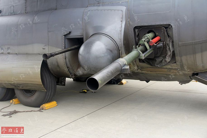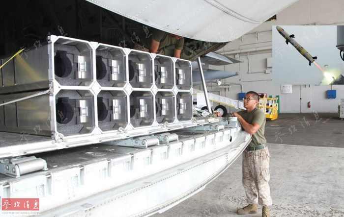 图为位于KC-130J“收割鹰”机尾舱门的10联装“格里芬”(狮鹫)微型导弹发射器 。该机属于VMGR-252加油机中队,本图摄于2015年5月7日,小图为舰载型“狮鹫”导弹发射瞬间。
