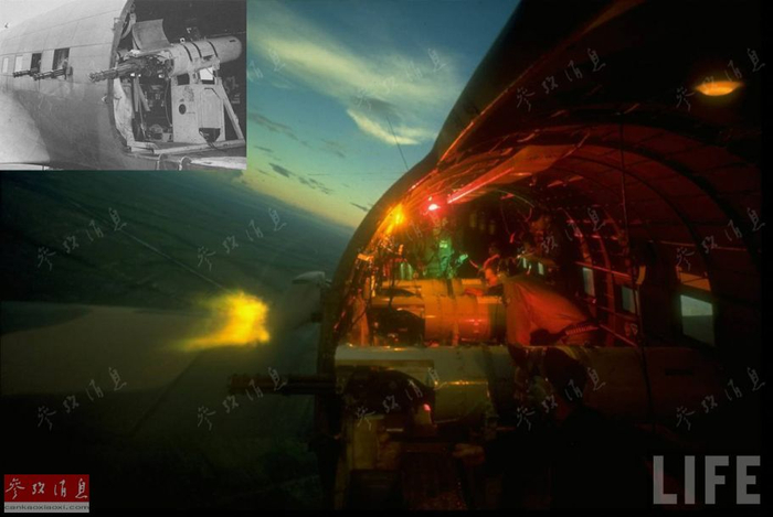 作为炮艇机的鼻祖,AC-47在机舱内安装了3挺7.62毫米M134加特林速射机枪(均朝向左方)组成侧射武器系统,加装这种系统的攻击机进行“灯塔盘旋”(Pylon Turn)机动时,射出的弹药能够在离心力的作用下自动指向目标,并能保持不间断火力压制射击,而且还能覆盖大面积区域。图为《生活》杂志当年拍摄的图片,直观反映了AC-47的作战时场面。小图为M134机枪特写。