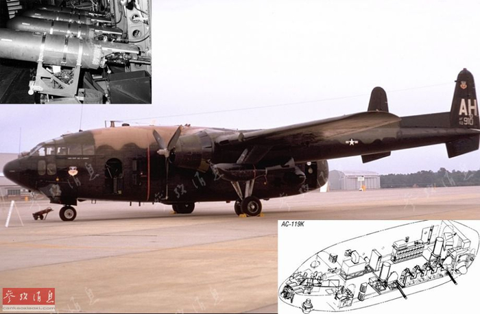 在AC-47上"小试牛刀"获得成功后,美军开始将更大的运输机改为炮艇机,基于C-119运输机改进的AC-119于 1968年11月投入服役,其中AC-119K“毒刺”的火力系统颇具规模,包括4挺M134速射机枪和2门六管20毫米加特林速射炮。图为1972年9月拍摄的AC-119K,左小图为AC-119舱内一字布置的M134机枪炮位,颇有古代风帆战舰排炮的感觉,右小图为该机武器布置示意图。