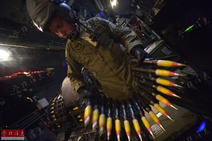 图为AC-130炮手在舱内为105毫米榴弹炮装弹。