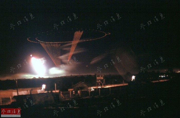 在这张摄于1969年5月,越南波莱古地区的照片能明显看到AC-47进行“灯塔盘旋”机动时,向目标射出的密集弹幕。