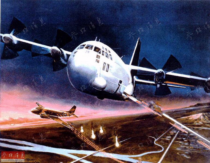 在积累了一定的作战经验后,美军于1967年在针对胡志明小道的“钢虎”绞杀作战中同时投入了3种炮艇机。战后据美军统计,AC-130在1971年11月到1972年4月期间,在对胡志明小道的封锁作战中,共击毁了2782辆越共军车,击伤4553辆。在整个越南战争中,AC-130A共击毁了1万辆以上的越共军车。图为艺术家绘制的越战期间,AC-130A与AC-47协同作战的场面。