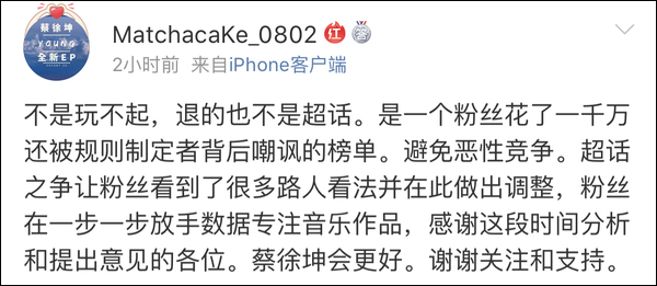 “至此,蔡徐坤粉丝联合声明退出微博各项数据榜单的竞争。”——我们不玩了。