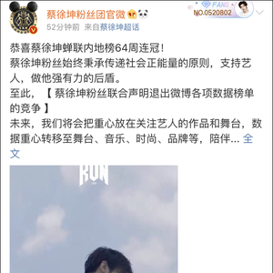 原标题:蔡徐坤粉丝团宣布将退出微博各项数据榜单竞争