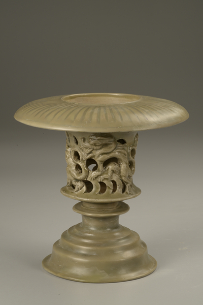 由内腹炉体、镂孔外套筒及喇叭形高圈足三部分组成。内腹炉体直口微敛,宽弧沿,斜弧腹,平底,沿上刻折扇纹,沿下套粘筒形外套筒。外套筒为束腰筒形,周身镂刻三层错位排列的月牙形和不规则形透孔,套底有榫。套筒壁一周贴塑三条首尾相随的行龙。喇叭形足上口与外套筒底榫相套粘,柱形腰处有一周凸棱,斜足面呈四层台式凸棱。内腹体内、高足内及足底露胎,余处施青釉,釉色青绿,均匀透亮,釉面局部开片。浅灰胎,质细密。