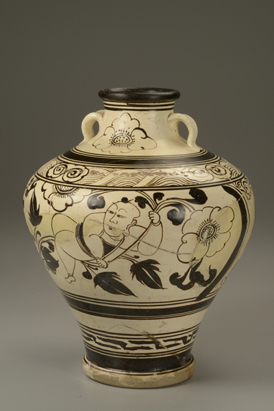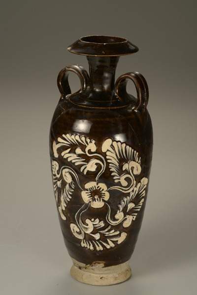 敞口折沿,细长颈,圆肩,深弧腹下斜收,饼足,底心略内凹。肩部饰高耸环形双系。内外满施黑釉,内壁釉层薄泛褐色,外厚釉至胫,以下露胎。深灰色胎,质略粗。腹部饰剔花填白彩花纹。白花在黑釉上格外清晰分明,是耀州窑在唐代所独创的一种装饰工艺。