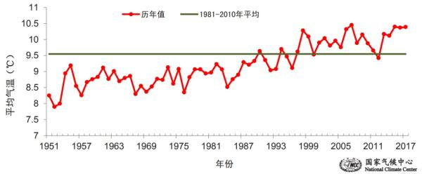 图1:1951-2017年全国年平均气温历年变化(单位:℃) 2017年中国气候公报 图