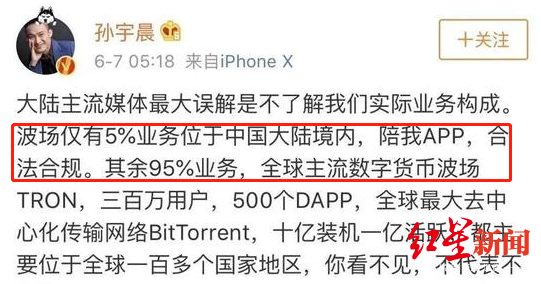 孙宇晨6月7日发微博称陪我App合法合规