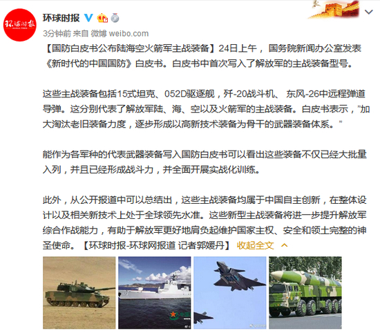 24日上午, 国务院新闻办公室发表《新时代的中国国防》白皮书。白皮书中首次写入了解放军的主战装备型号。