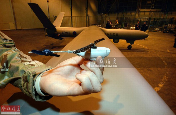 图为2014年英国空军沃丁顿基地公开日上,英军士兵手持“黑蜂”微型无人机与“守望者”高空长航时无人机合影,可见两者的尺寸差距。