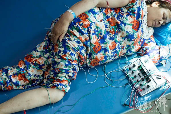 7月15日,一名维吾尔族老人在医院接受旋磁光电子热疗仪治疗。
