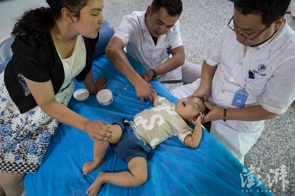 7月15日,陈麒医生使用推拿手法医治一名脑瘫儿童。陈医生擅长推拿,他与科室其他医生一起制定了一套治疗方案帮助这名患者,除了推拿、电流刺激、杨氏针灸还有肢体综合训练等手段。