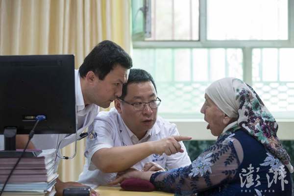 7月15日,陈麒在为当地维吾尔族老人看病,他的身边是本次结对的维吾尔医生帕热合提•吐尔逊。上海援疆指挥部全面开展技术人才“师徒结对、帮带提升”工作,培养若干个技术骨干,带动当地医院医疗技术水平的发展。