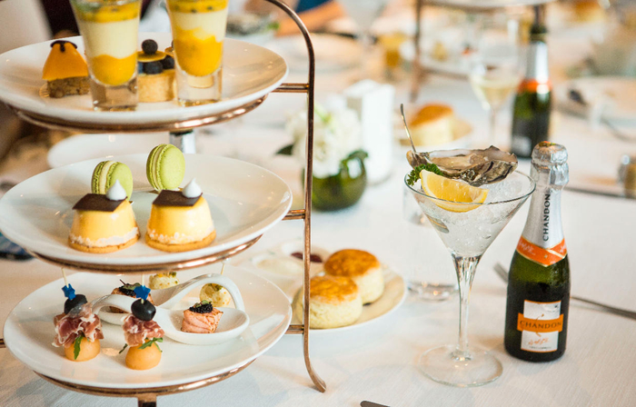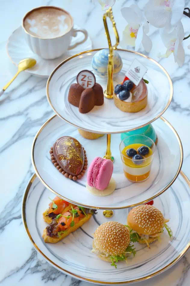 金色三层架共有3款咸点、6款甜点、2款松饼。咸点带来的趣味在于,让被甜浸润过的味蕾得到相宜的平衡。搭配口感清新的夏桐起泡酒,与甜咸点间相互衬托口感。