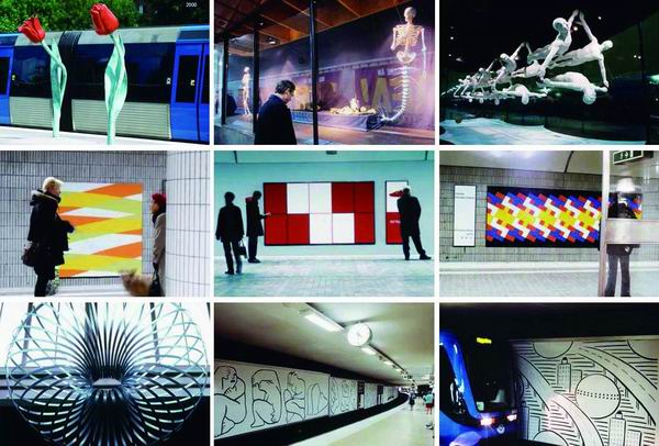 瑞典斯德哥尔摩地铁公司(SL)高度关注地铁公共艺术展览及活动的运作,在城市九十九个地铁站中,选择了六个车站作为艺术展览和活动的发布站点。瑞典政府希望通过这种方式为艺术家提供更多的展示机会,车站作品每年更换一到四次不等,展览时间长短根据乘客对艺术作品的喜爱程度而定。这六座车站的展示形式略有不同,Odenplan站利用地面站的站台设置长长的橱窗,主要展示立体艺术作品;Skanstull站主要展示影像作品;另外几个站利用列车行驶区域墙面来展示平面艺术作品。