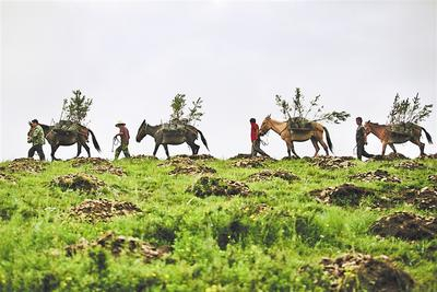 千松坝林场雨季造林期间,工人往山上运送树苗