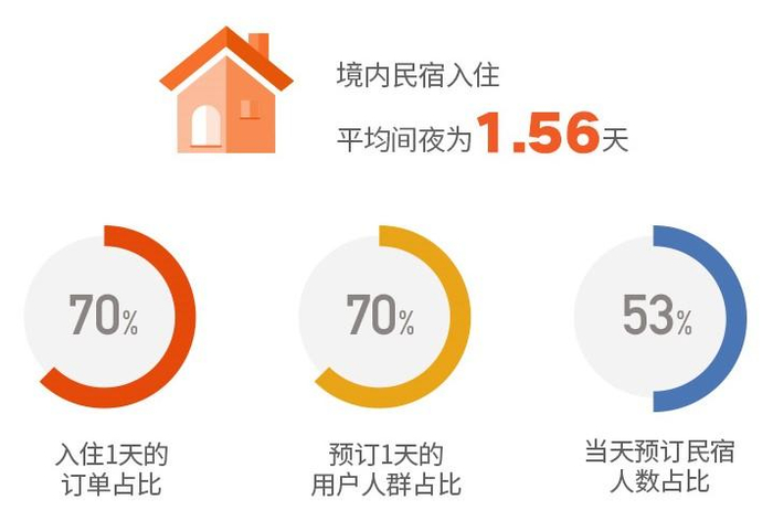相较于以往民宿3-6天的入住周期和提前3-5天的预订行为,今年上半年用户预订大有“短平快”的趋势。数据显示,途家境内民宿入住平均间夜为1.56天,入住一天的订单占比和预订人群均在70%以上,约53%的用户喜欢在当天预订民宿,超过18%的用户会选择在出发前一天预订。