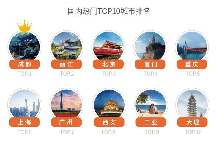 2019年上半年国内最热出行目的地TOP10城市中,成都位列榜首(连续三年蝉联榜首),TOP10城市依次为:成都、丽江、北京、重庆、厦门、上海、广州、西安、三亚、大理。