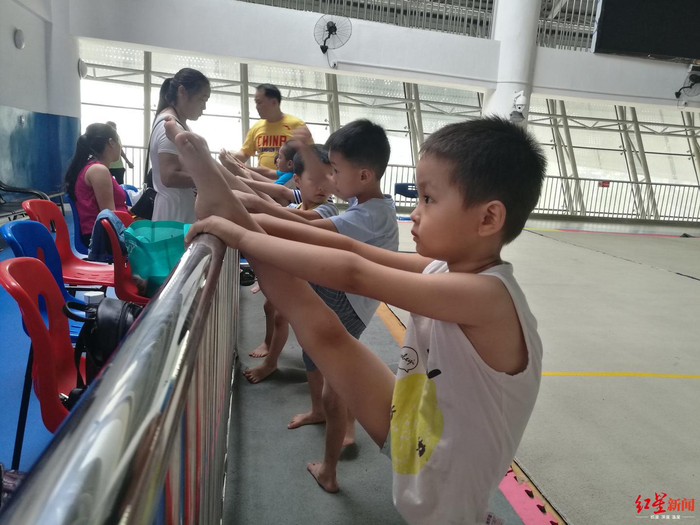 一群四五岁的孩子正在压腿,他们把一只脚搭在场边的护栏上,腿绷得直直的。家长就坐在孩子们面前,然后趁机上前,把插着吸管的水瓶递到孩子的嘴里。