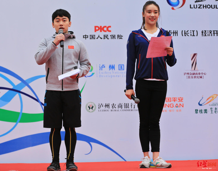 ▲2016年11月20日,四川泸州2016马拉松赛上,奥运“五金王”、泸州籍运动员邹凯和中国艺术体操队泸州籍运动员舒思瑶代表作运动员发言。图据ICphoto