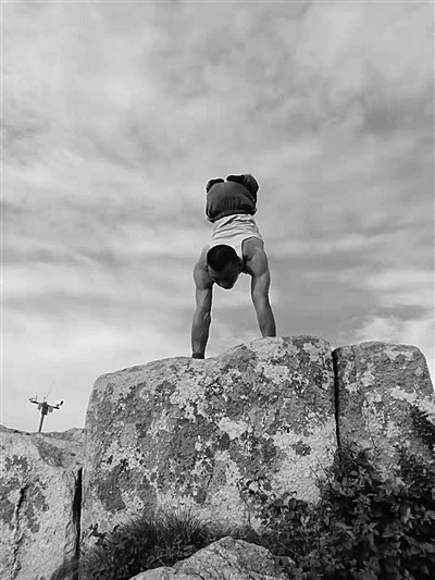刘红刚在泰山顶峰倒立。