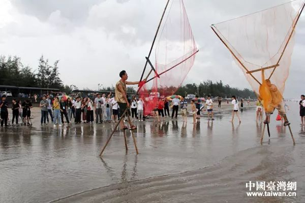 两岸媒体人观看京族渔民的绝活——踩高跷踏浪捕鱼虾。(中国台湾网 王怡然 摄)