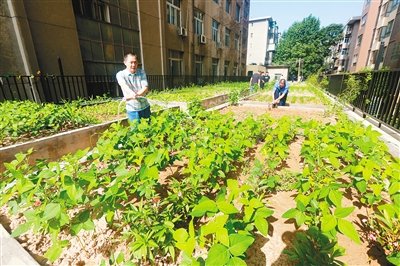 今年5月,经九路社区开始对办公区一楼平台进行绿化改造,聘请专业人员对房顶进行防水处理,架设水管,铺设瓷砖,在农艺师的指导下,社区工作人员和居民运土、浇水,种植时令蔬菜。
