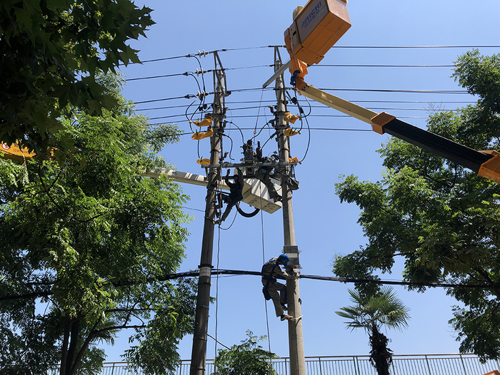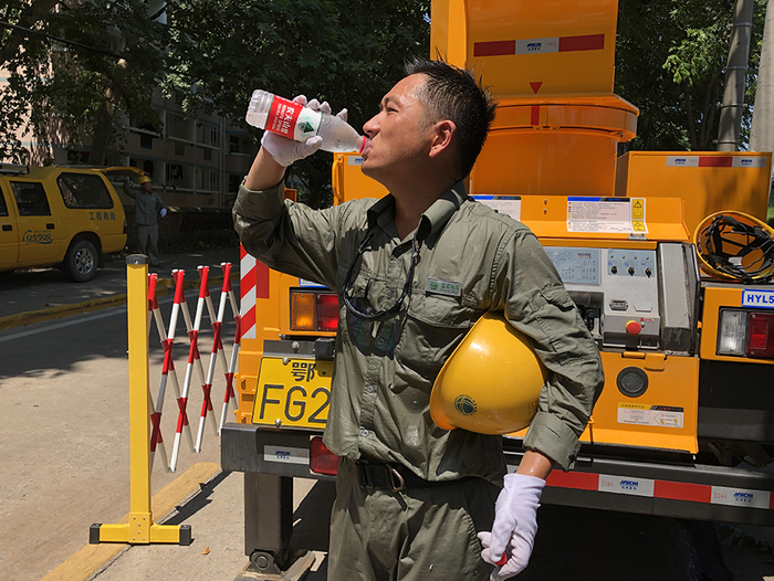 还未正式作业,李胜祖的后背早已汗湿,猛灌下一瓶矿泉水后,李胜祖开始操作绝缘斗臂车,升至10余米高操作面,拧螺丝、拆下故障开关。随后,三名电工脚踩脚扣,爬上线杆,配合将故障开关运下并安装控制箱。