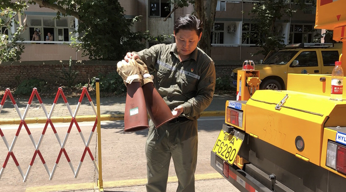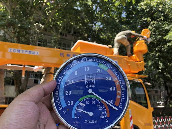 斗臂车内的温度计已爆表,李胜祖在空中作业时,温度已超过了50摄氏度,加上厚重的绝缘服,“透不过气来”。