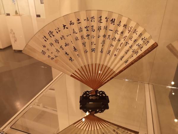 澎湃新闻从现场看到,在格调雅致、展示新颖的展厅,陈列着梁启超亲手所书赠给儿子梁思成、儿媳林徽因的书法扇面、林长民赠给女婿梁思成的手书丹砂长卷《养生论》,以及哈佛大学校长之女费慰梅赠给好友林徽因的贺卡。