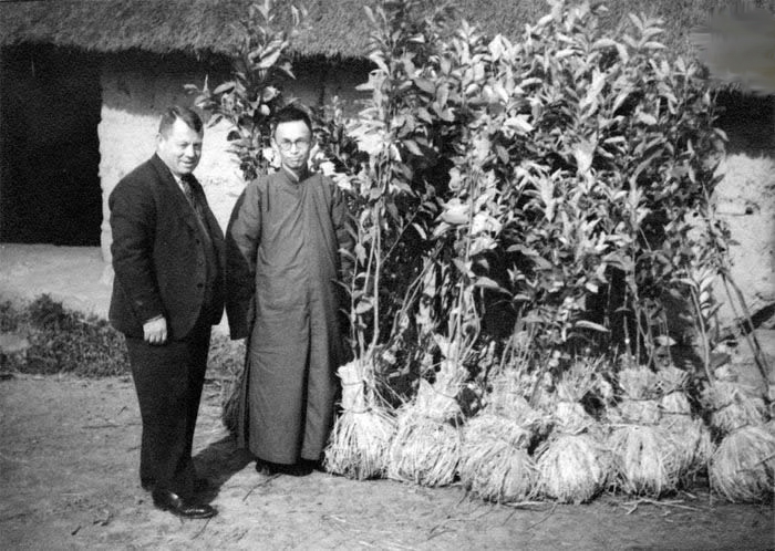 1939年,丁克生(左)与弟子在农场待种的果树苗前。