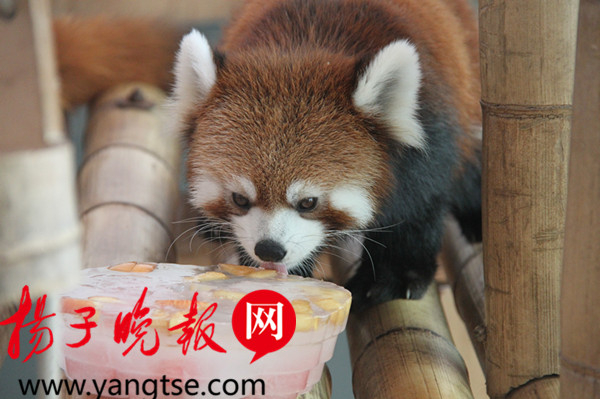 狐猴们一天中最开心的莫过于享受喷淋和在巨型冰块上品尝水果盛筵,有些贪凉的狐猴还会跳上冰块;国宝大熊猫吹着空调,享受着新鲜的竹叶,每天饲养员“爸爸”还会为其准备冰镇水果大餐,或放在睡床上或吊在空中的竹筒中,增加了大熊猫的取食难度也增加了它的运动量;小熊猫们则是在空调间享受竹叶和冰坨。