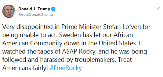 在推特上,特朗普先是说:“对勒文首相没能采取行动感到非常失望。瑞典让我们的非裔美国人群失望了。我看了罗基的录像,他当时被闹事者跟踪、骚扰。请公正地对待美国人!#放了A$AP Rocky”