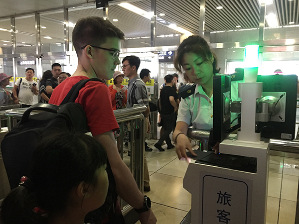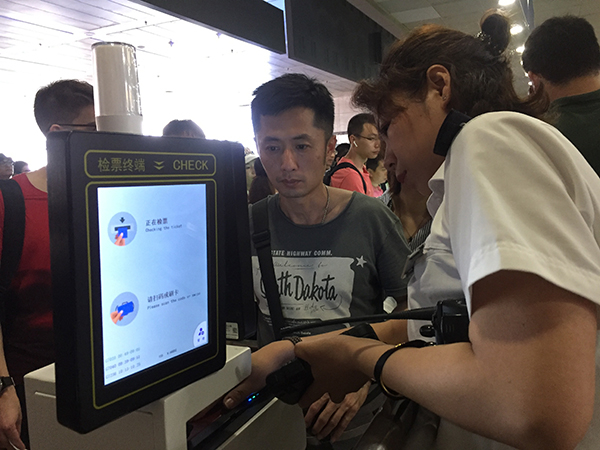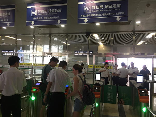 27日上午,铁路工作人员正用新改造的“旅客检票操作终端”帮一位乘客刷护照进站乘车。澎湃新闻记者 俞凯 摄
