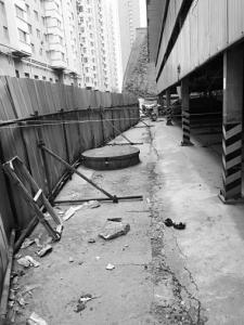 1号住宅楼对面东侧,约10米处有一个两层楼高的建筑物,即立体车库。车库外面围着一圈蓝色铁皮围栏,上面写着“施工危险请勿靠近”。山西晚报记者注意到,围栏有一个很大的缺口,能够容一个成年人出入。车库内停有两辆废旧轿车,车胎已没气,倒车镜也被掰断。