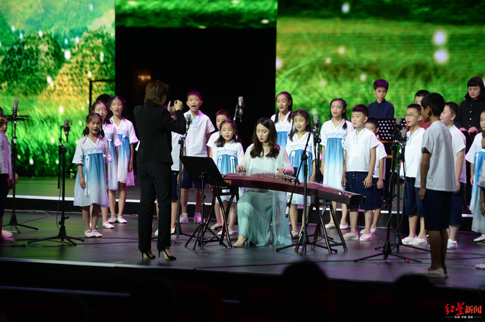 紧接着,《鹧鸪天》《羌汉山歌》《纳吉花儿歌》等轮番开唱。红星新闻在现场发现,这些作品立足于中国文化深厚基础,思考音乐文化本源,充分挖掘古诗词与音乐最本真的关系,用音乐还原和扩大古诗词的韵律美,是汉语语言旋律性的回归。龢龠童声合唱团的小朋友,则为现场观众带来《童趣》《茶》两首合唱歌曲。在灯光的照耀下,每一位孩子的脸上都熠熠生辉。他们的表演既表现出充分的诗词歌赋吟诵能力,又充满了欢乐的童趣,惹得人们又怜又爱。