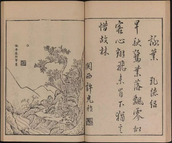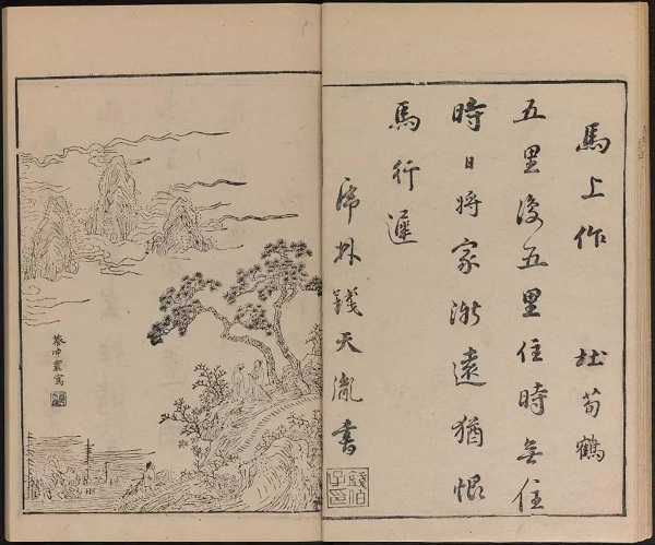 《八种画谱》又称《唐诗画谱》,由明代集雅斋主人黄凤池编辑,大约刊印于1672年。为诗、书、画三美合一的版画图谱,是徽派版画代表作之一。此本包含八种画谱:五言唐诗画谱、六言唐诗画谱、七言唐诗画谱、梅竹兰菊四谱、木本花鸟谱、草本花诗谱、唐解元仿古今画谱、张白云选名公扇谱。而对于《八种画谱》的学习,从池大雅二十二岁的作品《渭城柳色》中就可以看到画谱的影子,用笔简练且线条纤细,明显是受木板画谱的影响。《八种画谱》的很多图样都是如此。